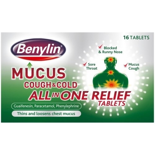 Benylin Mucus Cough & Cold All in One Relief Tablets for the relief of symptoms associated with colds and flu, including aches and pains, headaches, blocked nose and sore throat, chills and chesty coughs.